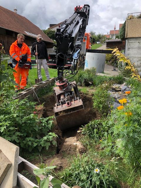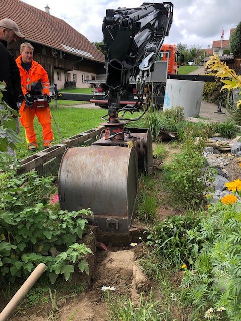Für das Setzen des Schachts hat unser Nachbar einen Kran mit Schaufel organisiert. Sehr hilfreich, denn ca. 2m³ Erde ausheben geht so um einiges einfacher und der Schacht könnte auf keinen Fall von Hand gehoben werden.