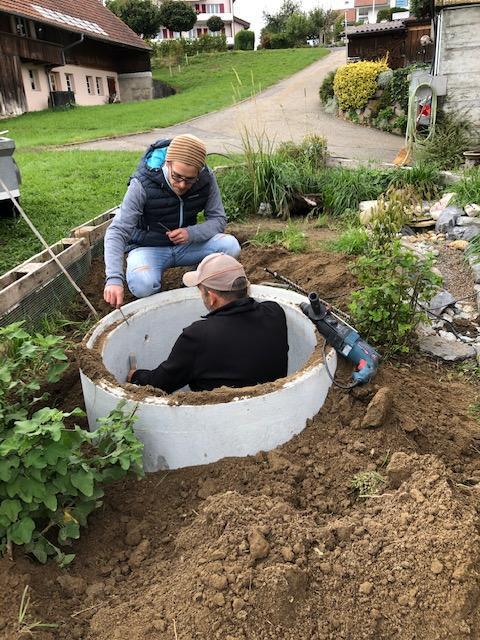 Nach gelegentlichem Austausch mit unserem Nachbarn waren wir plötzlich Besitzer eines Betonschachtes. Und da ja eben die Platzansprüche einer Schildkröte nicht unwesentlich sind, fiel dieser Schacht auch beträchtlich gross aus. Wir staunten nicht schlecht und fragten uns sogleich berechtigterweise:“ Und wie bekommen wir dieses Monster nun in das Gehege und vor allem in den Boden?“