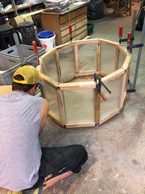Bevor die beiden 10-Ecke („Ringe“) verleimt wurden, habe ich sie mit den Nuten für die Doppelstegplatten versehen. Zusätzlich habe ich beim unteren „Ring“ in die Nut eine weitere Kerbe gefräst um das Kondenswasser ableiten zu können. Dies indem pro Stück aus der Kerbe jeweils 2 Bohrungen nach außen führen. Ansonsten sind die beiden „Ringe“ identisch.