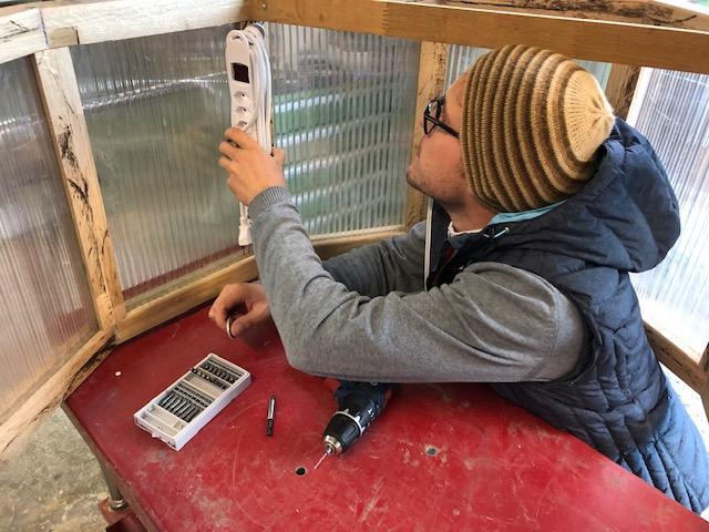 Das Haus hat anschließend eine Strebe erhalten wo wir die Lampe und Kabel aufhängen. Eine handelsübliche Steckleiste verwenden wir für die Stromverteilung im Haus. Dabei haben wir die Thermosteckdose in eine Zeitschaltuhr gesteckt, damit die Lampe auf Temperatur und Zeit geschaltet werden kann.