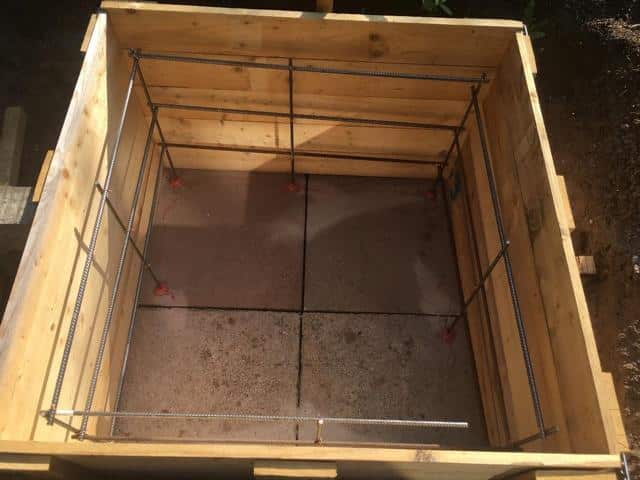 Danach ging es an den Bau der Schalung. Als Material haben wir Palettenholz und sonstige Holzreste verwendet die wir vorrätig hatten. Das Ganze wurde mit Winkeln stabilisiert. Die Eisenstangen sind einzelne Teile von Eisengeflechten speziell für Betonarbeiten. Am Boden auf den Platten fixiert mit Montagekleber. Das Eisengeflecht ist wichtig für die Stabilität des Betons und dass dieser nicht reist.