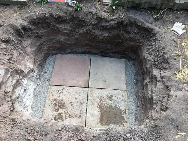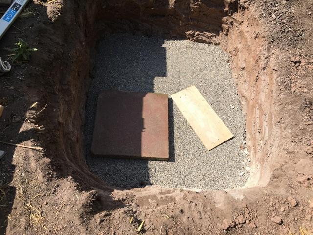 Damit die Grube von unten gegen Fressfeinde gesichert werden konnte wurden Platten gelegt. Damit diese ausgerichtet werden konnten, wurde feiner Split verwendet.