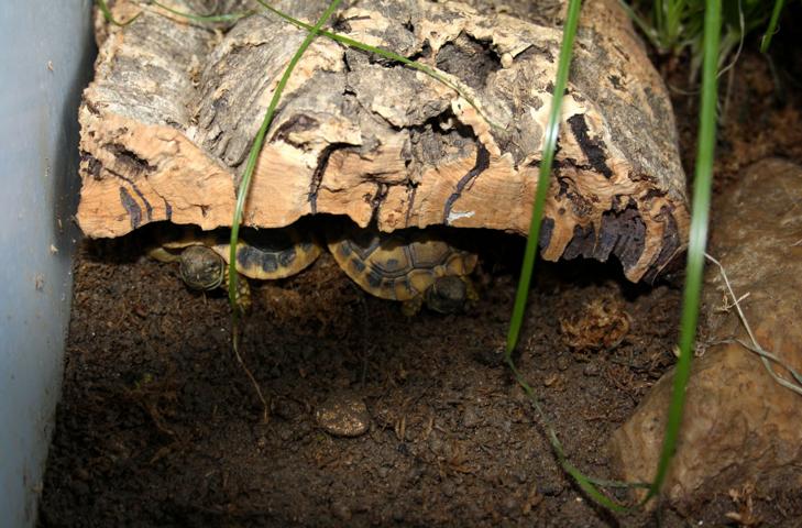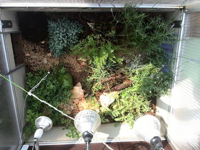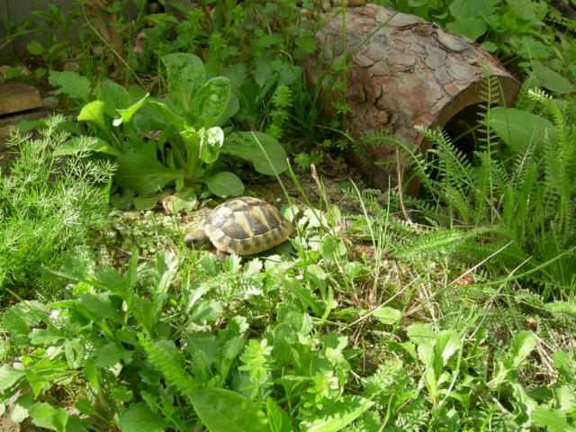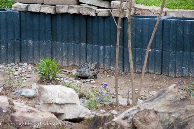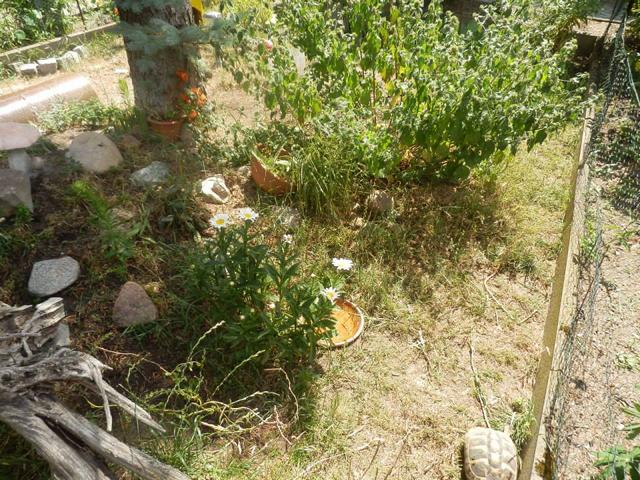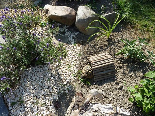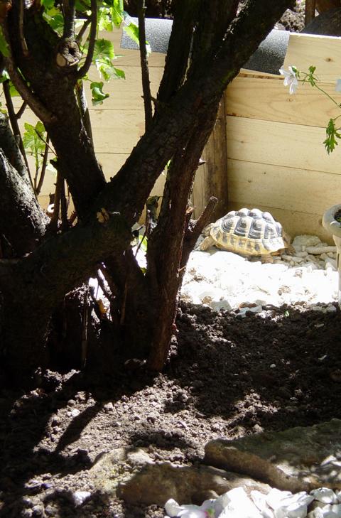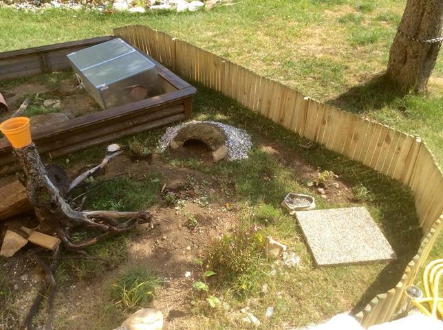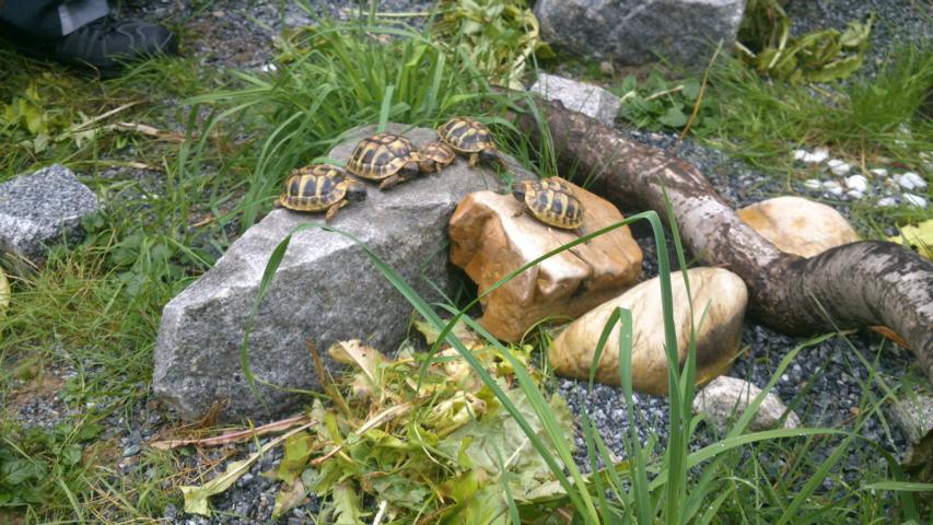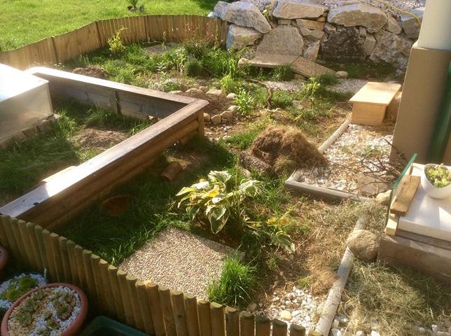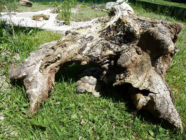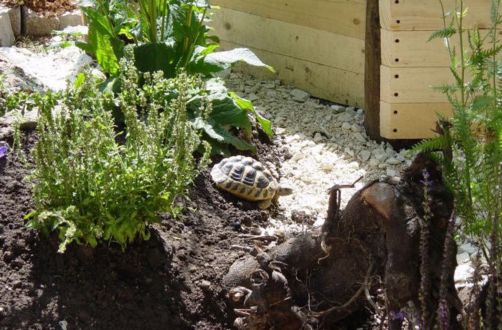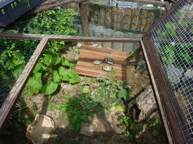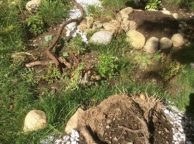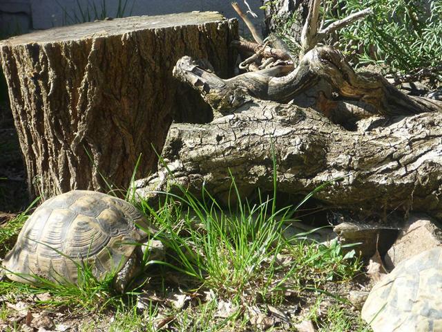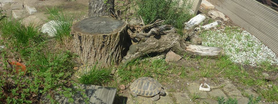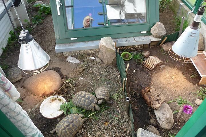In diesem 25 qm großen Gehege leben momentan drei adulte Landschildkröten aus schlechter Terrarienhaltung. Sie wurden über 8 Jahre zusammen im Terrarium gehalten und hielten wohl nie eine Winterstarre.