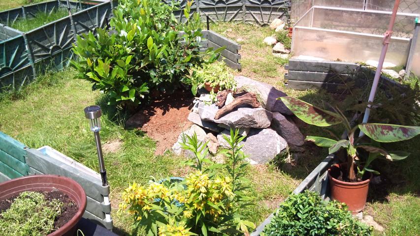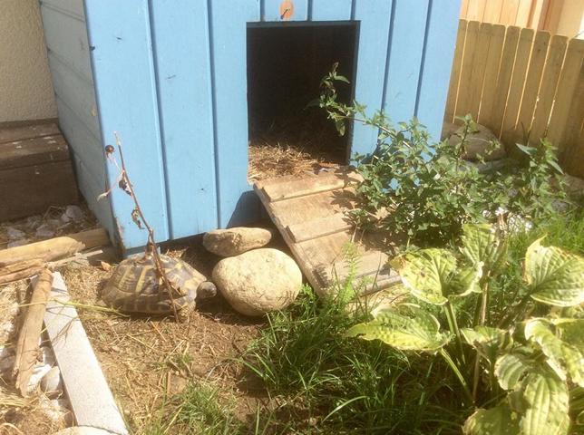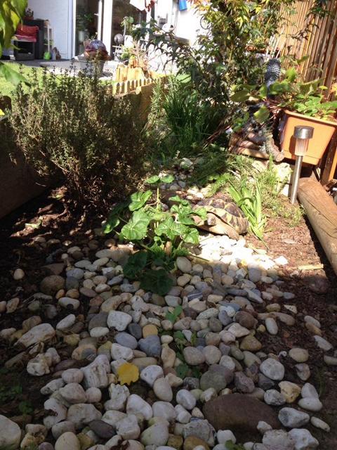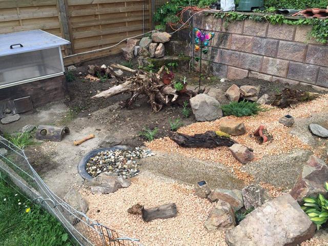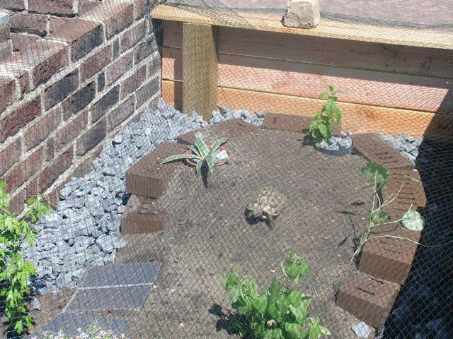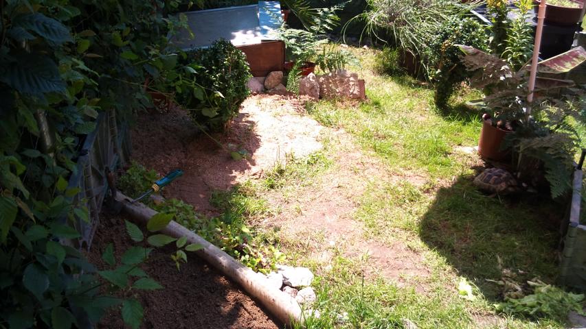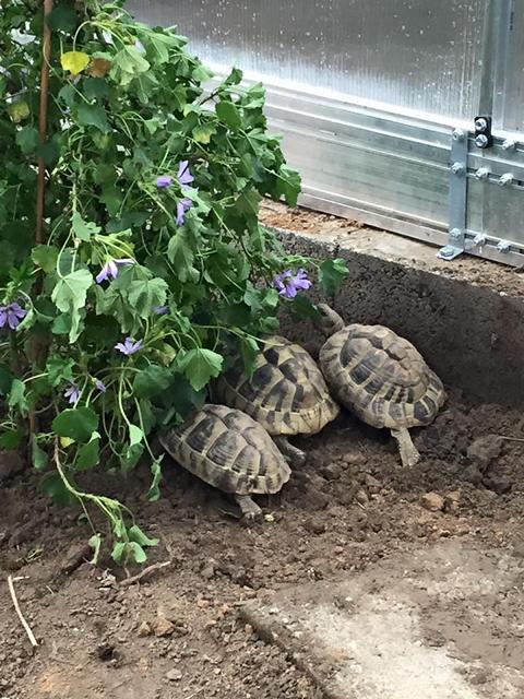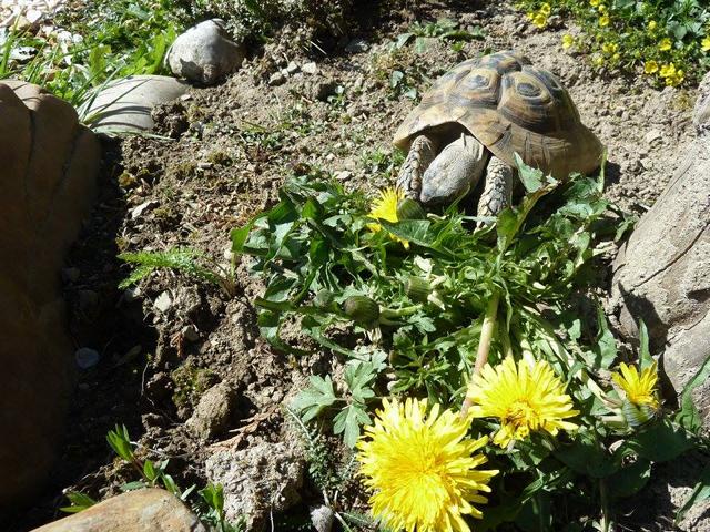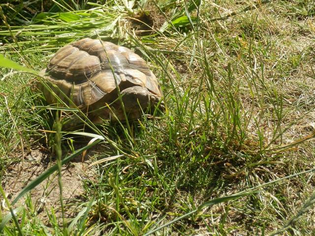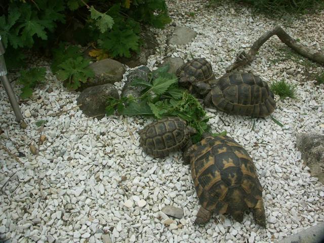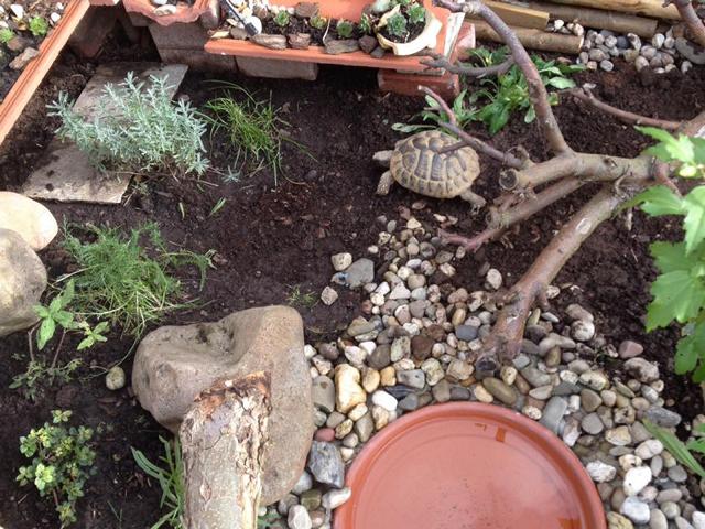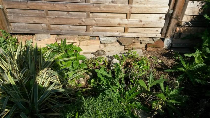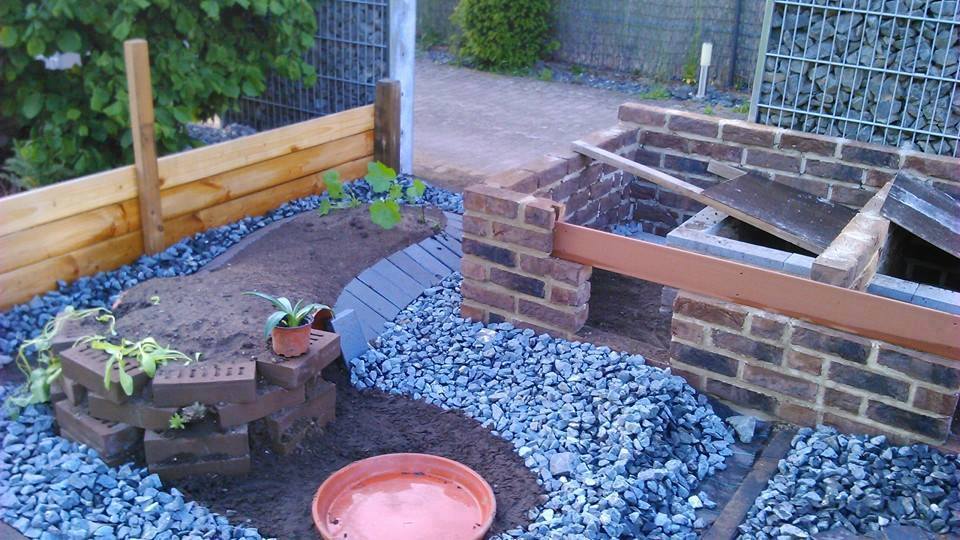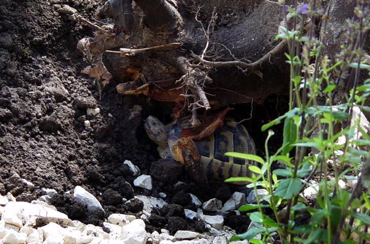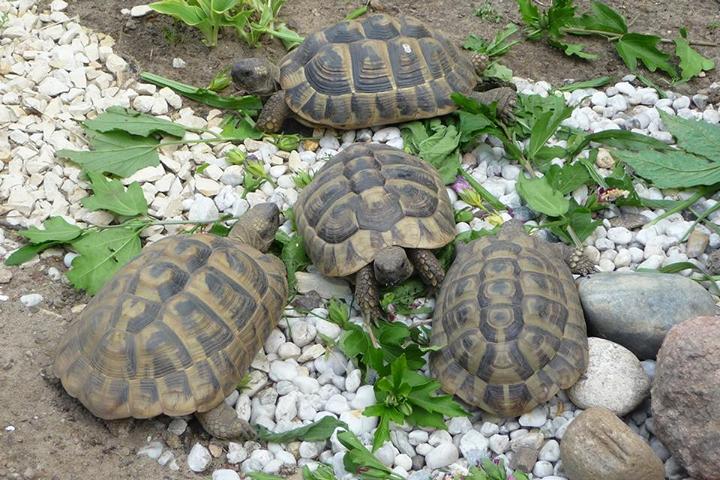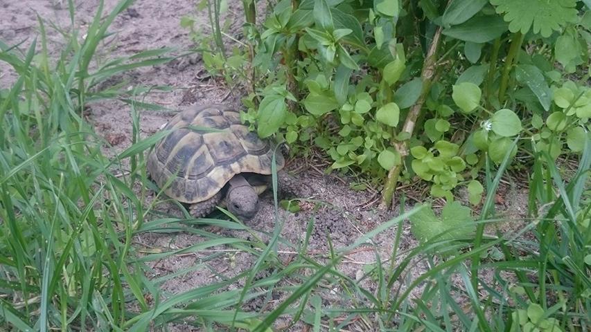 In diesem 25 qm großen Gehege leben momentan drei adulte Landschildkröten aus schlechter Terrarienhaltung. Sie wurden über 8 Jahre zusammen im Terrarium gehalten und hielten wohl nie eine Winterstarre.