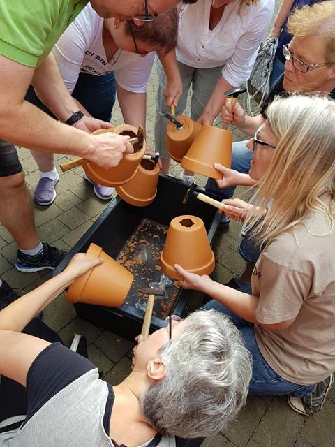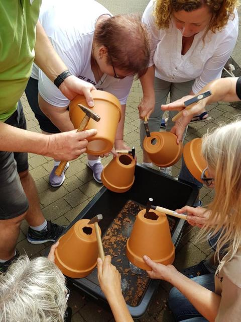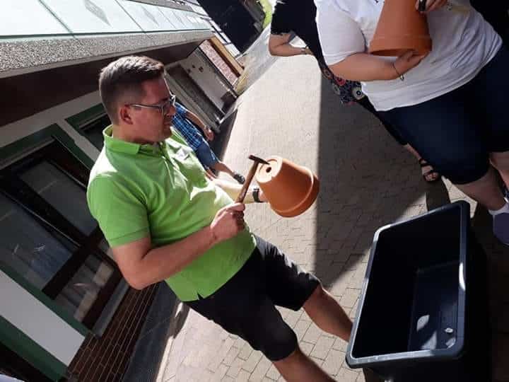 Eine, wie ich finde, super Idee! Während ich mich mit Sonja also weiter im Zimmer aufhielt….ähm natürlich im Konferenzzimmer! Hörten wir also, wie sich erwachsene Personen mit Hammer an die armen Tontöpfen zu schaffen machten. Begleitet von lautem Kichern und Gejohle!