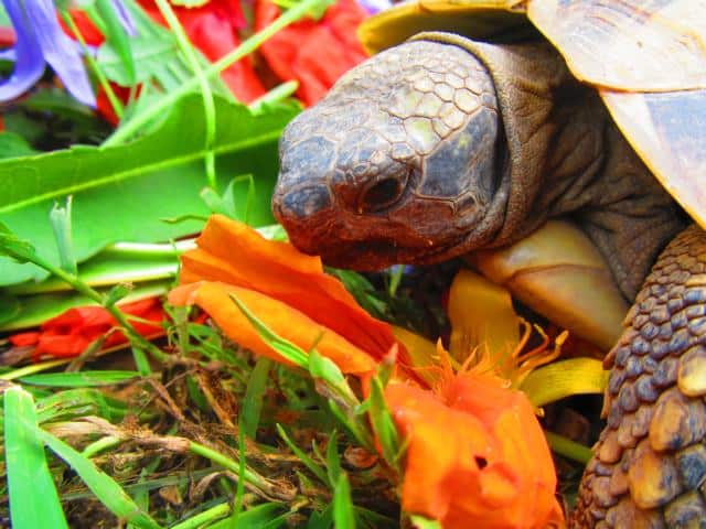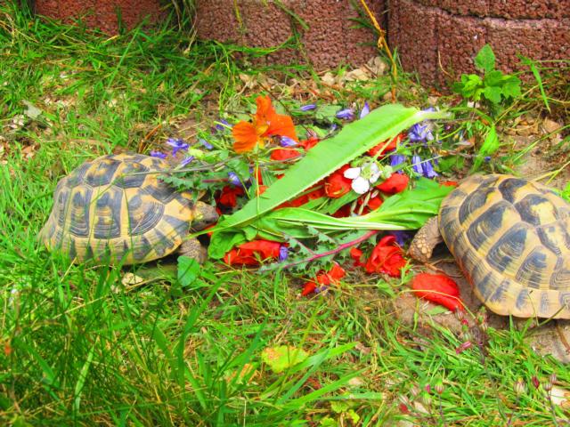 Das Auge isst mit. Diesen Spruch kennt ja jeder. Gilt auch für die Schildkröten, die sich bevorzugt auf rote, gelbe und blaue Leckerlis stürzen. Ich konnte bei unseren Tieren beobachten, dass sie Blüten mit diesen Farben mit Vorliebe zuerst anknabbern.
