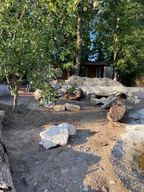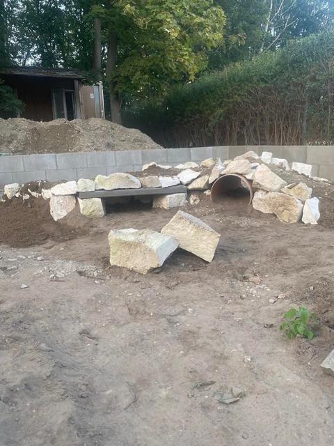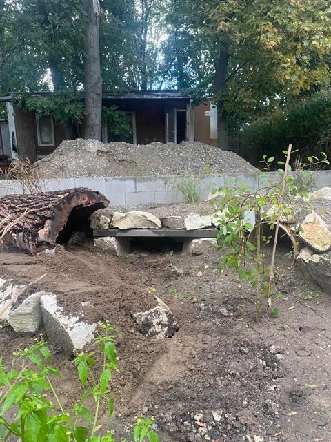 Jetzt kam endlich der schöne Teil, die Gestaltung. Mit großen Baumstämmen, die wir noch vom Hausbau hatten, teilten wir das Gehege in unterschiedliche Bereiche. Durch Kalksteine entstanden Erhöhungen und Höhlen. Ein KG Rohr (40cm Durchmesser) wurde für einen Tunnel verwendet.