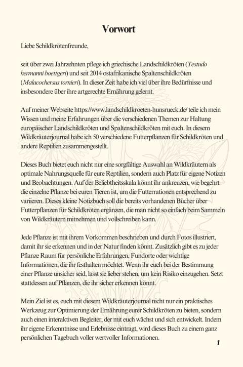 Mit diesem handlichen Taschenbuch möchte ich dich dabei unterstützen, direkt in der Natur neue Futterpflanzen für deine Schildkröten zu finden und Informationen dazu festzuhalten. So kannst du ganz einfach für eine vielfältige und artgerechte Ernährung deiner Reptilien sorgen. Dieses Journal wird dir helfen, dein Wissen über geeignete Futterpflanzen zu erweitern und zu vertiefen.