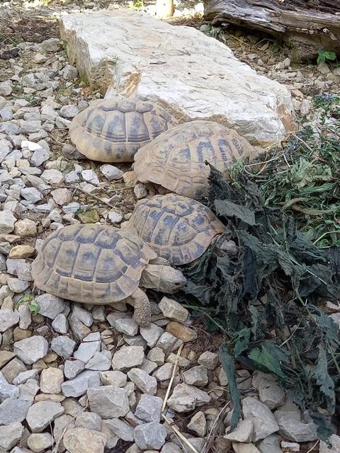 Griechische Landschildkröten in unserem Freigehege beim Fressen von Weigelie-Blüten