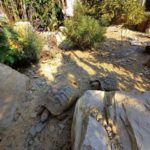 Nachdem ich nun mit dem ausgehoben Erdmaterial Senken und Erhebungen modelliert hatte, wurden noch verschiedene, dickere Äste und Steine ins Gehege eingebracht. Ich hatte dann das Glück aus einem abgerissen Bruchsteinhaus einen Anhänger voll Steine zu bekommen. Es waren verschieden große Schiefersteine, die ich nun benutzen konnte, um eine kleine Mauer zu ziehen, Höhlen zu bauen oder als Sonnenplätze zu platzieren. Diese Steine werden sehr gerne von unseren Tieren als Wärmequelle benutzt, da Schiefer die Wärme sehr gut annimmt, lange speichert und abends dann wieder abgibt. So kommt es oft vor, das ich einige Tiere am Tagesende, wenn die Türen der Frühbeete und des Schildkrötenhauses geschlossen werden, aus einer Höhle raus nehmen muss, weil dort dann immer noch angenehme Temperaturen herrschen.