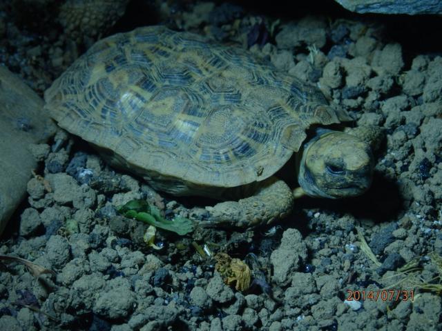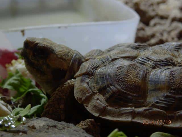 Mittlerweile haben sich die beiden sehr gut eingelebt und auch das größere Tier hat immer mehr die Scheu abgelegt und ist fast täglich außerhalb „ihrer“ Spalte unterwegs. Während das kleinere Tier relativ zügig die Spalte verlässt und sich erstmal unter der Wärmelampe auf „Betriebstemperatur“ bringt, beäugt das ältere Weibchen zuerst etwas misstrauisch aus ihrer Spalte die Umgebung, bevor sie dann langsam auch den Sonnenplatz aufsucht. Ging sie dann vor Wochen gleich wieder in ihre Spalte wenn ich das Zimmer betrat, bleibt sie nun auf ihrem Platz und beobachtet mich mit Interesse. Hier sieht man dann auch, wie unter-schiedlich Charakteren von Schildkröten sein können. Das jüngere Tier benötigte nur wenige Wochen, um sich an die neue Umgebung und an mich zu gewöhnen, während das andere Weibchen schon mehrere Monate brauchte um seine Zurückhaltung abzulegen. Beide reagieren aber empfindlich, wenn Änderungen im Terrarium vorgenommen werde. Sie verkriechen sich dann mehrere Tage in ihren Spalten und erst der Hunger treibt sie dann raus.