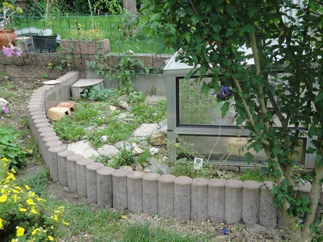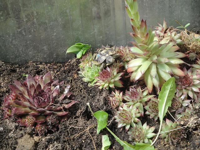 Ich habe z.B. eine Gehegegröße für die Jungtiere von ca. 2 qm inkl. dem Frühbeet in diesem Jahr neu gebaut. Dieses wird dann genauso eingerichtet, wie das Gehege der adulten Tiere. Also Frühbeet mit Technik, Versteckpflanzen, Futterpflanzen, Steine und Äste zur Strukturierung des Geheges. Die Tiere sollen die Möglichkeit haben sich auch mal auf einer Steinplatte aufwärmen , aber auch sich bei Bedarf verstecken zu können. Hier sollte aber das Hauptaugenmerk, im Gegensatz zu den adulten Tieren, mehr auf Versteckplätze gerichtet sein.