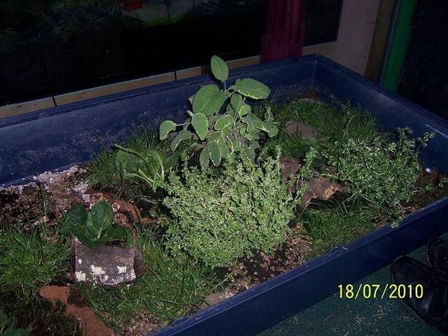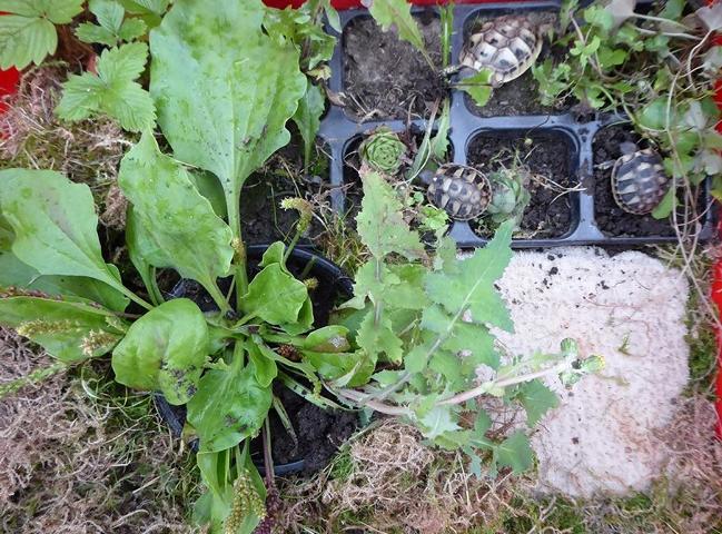 Eine andere Möglichkeit den Tieren, zumindest vorübergehend, eine naturnahe „Landschaft“ zu bieten sind transportable Gehege. Hier wird z.b. ein ausrangierter Hasenkäfig oder ein vergleichbarer Behälter genommen (z.B. eine kleine Mörtelwanne, Plastikbox) und so eingerichtet wie ein Gehege. Am besten würde sich hier feine Gartenerde eignen (Maulwurferde) bepflanzt mit diversen Futter- und Versteckpflanzen. Alternativ zu der Gartenerde kann auch von Floragard das Schildkrötensubstrat genommen werden. Es wird ja nicht so viel benötigt. Nicht zu vergessen im Boden des Behälters einige Löcher zu bohren, damit bei einem Regenschauer das Wasser gut abfließen kann und nicht das aus Landschildkröten auf einmal Wasserschildkröten werden.