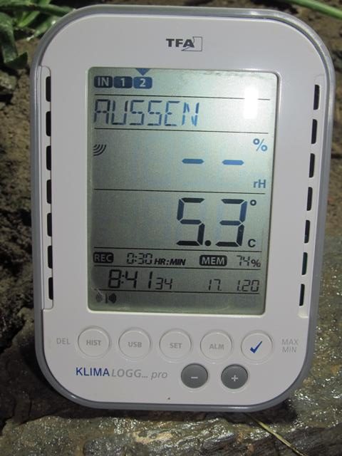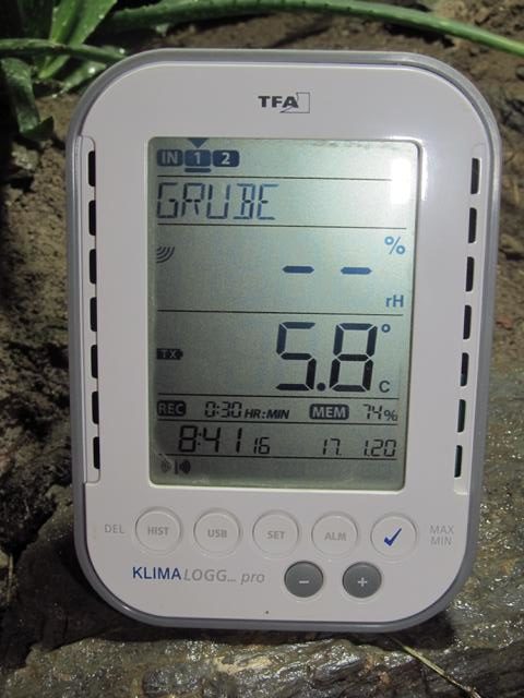 Die Kontrolle bei uns beschränkt sich lediglich darin, kurz den Deckel der Grube zu öffnen und zu schauen, ob alles so weit in Ordnung. Die Temperaturen in der Grube bzw. auch am Schildkrötenhaus im Freien werden mir im Büro anhand des Datenloggers angezeigt. Dafür habe ich einen Temperaturfühler in der Grube, in der Nähe eines der Tiere, angebracht (meistens in der Nähe unserer Susi, da sie sich nur wenig eingräbt) und ein weiterer Fühler misst die Temperatur im Freien am Schildkrötenhaus. Diese Daten werden vom Datenlogger alle halbe Stunde gespeichert, so dass ich auch sehen kann, wie nachts die Temperaturen waren.