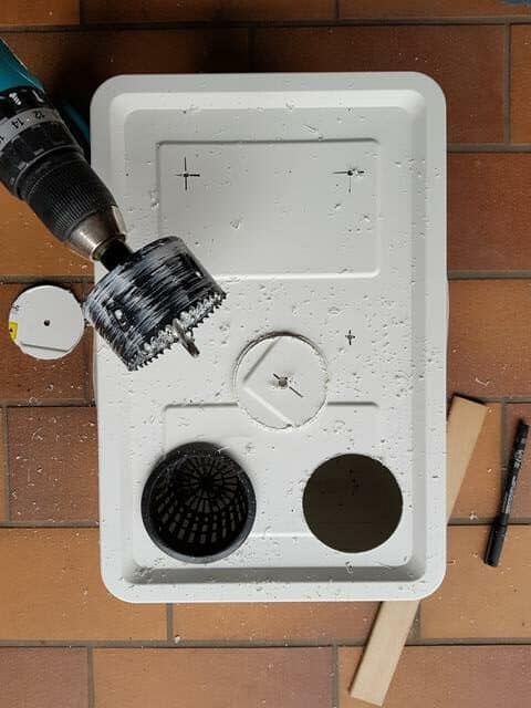 Es funktioniert tatsächlich! Diese Version der Tiefwasser-Kultur kommt ohne Strom aus. Das Prinzip ist sehr einfach und gelingt sehr gut. Sie benötigen eine dunkle (nicht transparente) Kunststoffkiste mit Deckel (ca. 10,– €). In den Deckel werden Löcher für die Netztöpfe (ca. 0,20 € pro Stück) im entsprechenden Durchmesser gebohrt. Dazu ist die Verwendung eines Kronenbohrers (ca. 15,– €) von großer Hilfe. Denken Sie daran genügend Abstand zwischen den Töpfen zu lassen, damit sich jede Pflanze gut entwickeln kann.