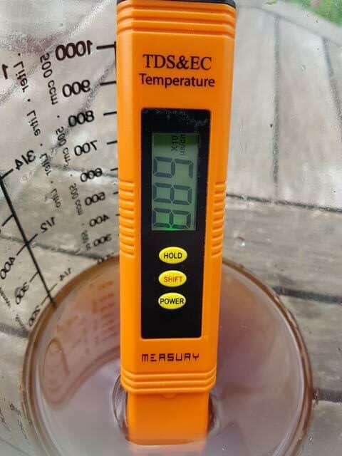 Am Beispiel Blaukorn flüssig hatte ich hier Düngewerte von ca. 9.000 μS/cm gemessen (wovon ja wie bereits geschildert viel durch Versickerung überflüssigerweise in das Erdreich gelangte). Meinen Hydroponik-Wert von etwa 1.000 μS/cm ist da im Vergleich wirklich relativ gering (konstant niedrig anstelle unregelmäßige hohe Gaben). Das Messen des Düngewertes kann mit einem EC-Messgerät* durchgeführt werden (Kosten ca. € 20,-).