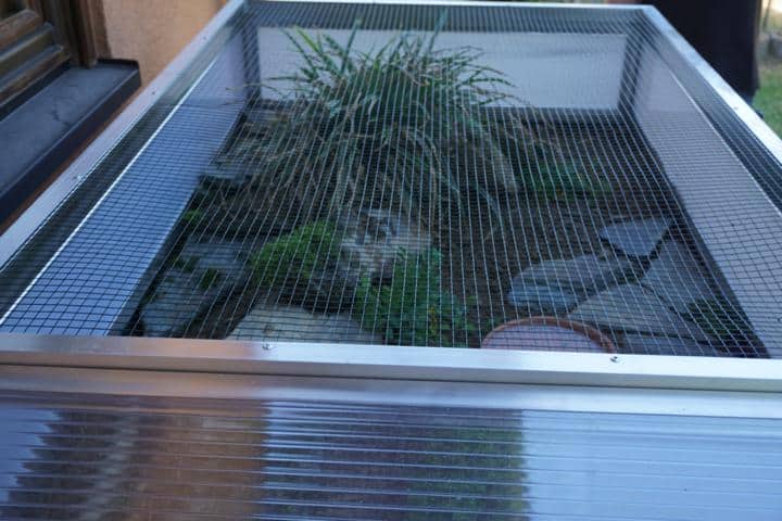 Als weiterer Tagespunkt stand die Einrichtung unseres neuen Außengeheges für die Pancaketurtles an. Zwei Wochen vorher war das Gestell, das ich nach meinen Wünschen von Soli Animalis bauen ließ (an dieser Stelle nochmals ein großes „Dankeschön“ an Kai!) Angeliefert worden und zusammen mit Freddy richtig in Stellung gebracht.