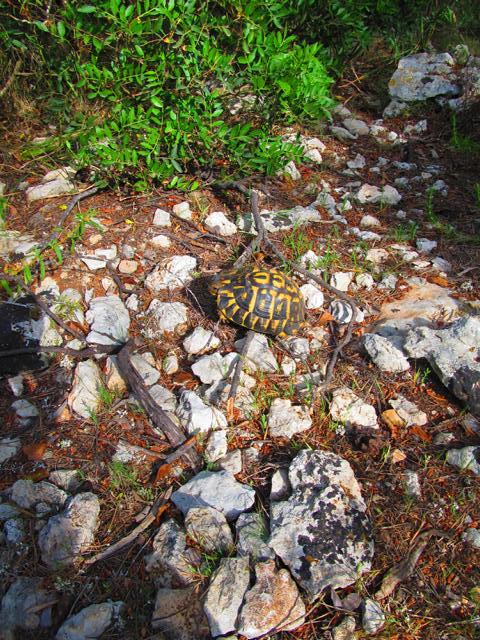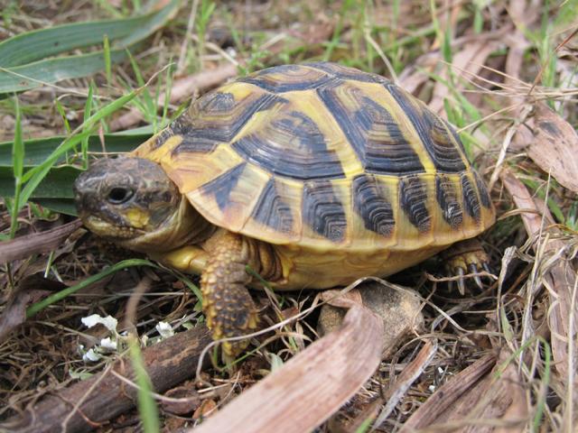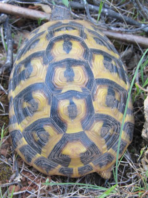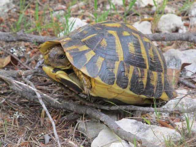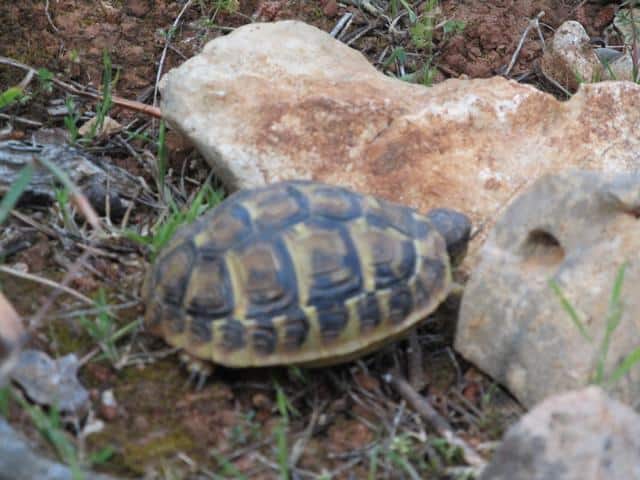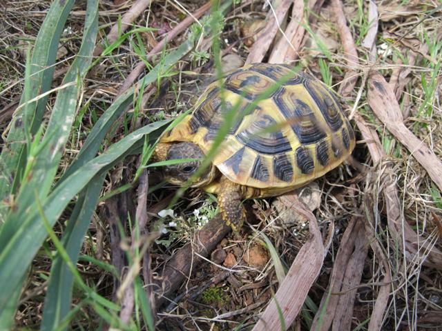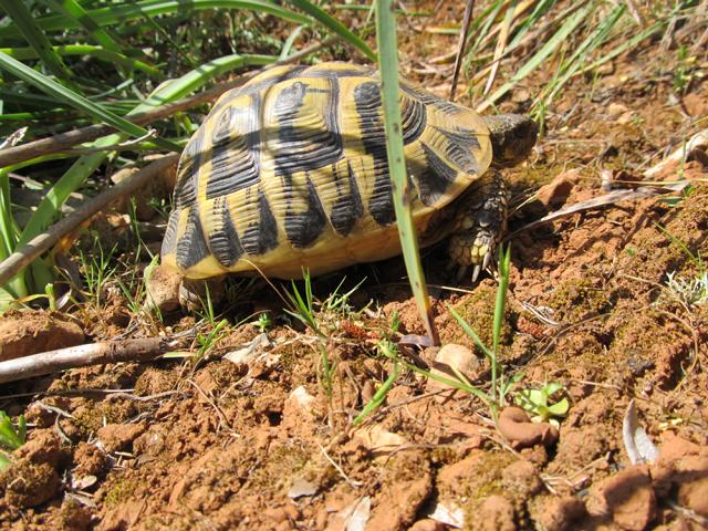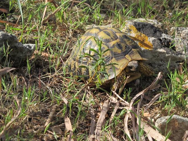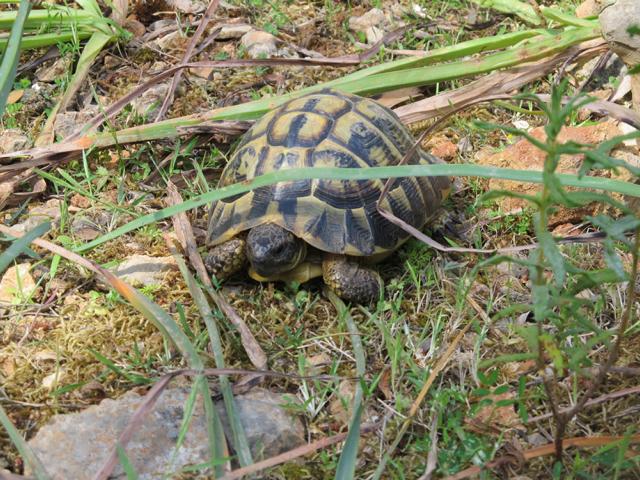 Dieses Gebiet war leicht abfallend und daher eigentlich als Schildkrötenhabitat optimal. In dieser Garrigue dürften wir Schildkröten finden. Und so dauerte es auch nicht allzu lange, bis Bettina das erste Mal „Schildkröte!“ rief.