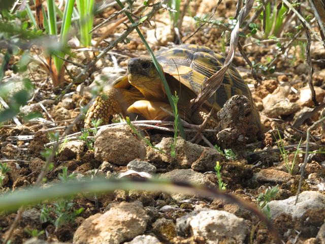 Am ersten Ziel dann angekommen, parkten wir am Straßenrand und gingen nach wenigen Metern ins Habitat. Dieses sah nun wieder ganz anders aus. Flaches Gebiet, sehr steinig mit vielen Sträuchern. Dies war auch kein Naturschutzgebiet, denn nur wenige Meter weiter wurde wohl kurz vorher der Boden bearbeitet. Es war auch schon wieder sehr warm an diesem Morgen und ich bezweifelte hier überhaupt Schildkröten zu finden.