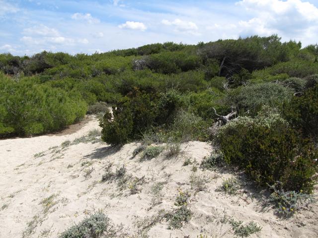 Hier parkten wir in der Nähe eines Hotels, das auch direkt an diesem Naturschutzgebiet liegt. Hier waren wir nur wenige Meter von einem herrlichen Strand entfernt. Für mich irgendwie merkwürdig. Links ein tolle Strand mit feinem, weißen Sand und nur wenige Meter dahinter ein Schildkrötenhabitat? Aber genau hier hat unser Informant auch Tiere gefunden! Also bogen wir nach rechts ab. Und tatsächlich! Nach wenigen Metern fand Bettina schon erste Spuren von Schildkröten im feinen Sand! Und nur weniger Meter weiter sah ich dann eine Testudo hermanni hermanni! Wir gingen dann tiefer ins Gebiet, das nun von hohen Aleppo-Kiefern beherrscht wurde. Also nur wenige Kilometer von unserem ersten Ziel mit nur Büschen, jetzt wieder ein ganz anderes Habitat! Wir fanden in kurzer Zeit noch zwei weitere Tiere und gingen noch etwas tiefer ins Gebiet. Doch mittlerweile war es schon sehr warm und die Damen wollten auch unbedingt noch an den Strand.