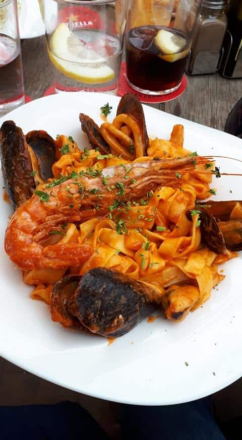 Gegen Abend ging es dann wieder in unser Stammrestaurant in der Bucht. Bei unserem Kellner Andi ( Ein Münchner auf Mallorca) bestellte ich dann erst mal ein richtig kühles Weizenbier. Wenn man schon mal in der Ferne ist, soll man ja auch eine kulinarische Spezialität ausprobieren. Ich bestellte dann zusammen mit Bettina ein spanisches Reisgericht aus der Pfanne: