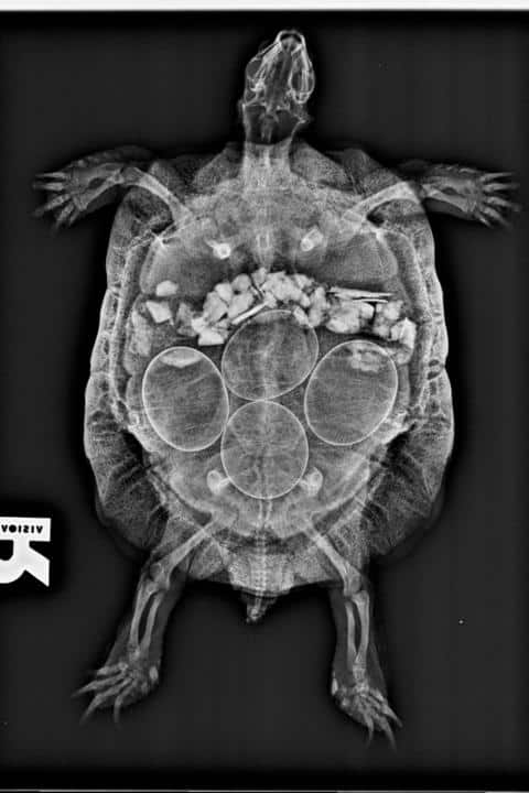 Somit wird sehr häufig auf das Wehen auslösende Hormon Oxytocin zurückgegriffen. Und in vielen Fällen sorgt dies dafür, dass die Eier zeitnah bis unmittelbar nach der „Wehenspritze“ gelegt werden. Doch nicht selten kommt es hierbei zu Komplikationen, die in vielen Fällen gar nicht erkannt werden: übertragene Eier bleiben im Becken stecken, Eier werden aufeinander geschoben, so dass es zum Schalenriss, manchmal auch dem Riss des Legedarmes kommt. Ist das Becken nicht auf die Eiablage vorbereitet und somit zu eng, können Eier in die Harnblase, in den Enddarm, bei Wasserschildkröten auch in die beiden als Wassertanks dienenden Analblasen rutschen. Dass es hierzu gekommen ist, wird dann nur bei weiteren Röntgenaufnahmen entdeckt.