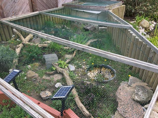 Die Europäer natürlich ganzjährig im Außengehege mit vielen leckeren Wildkräutern und einem Frühbeet mit entsprechender Technik: PAR38 Strahler als Wärmequelle für tagsüber und einen Elsteinstrahler nachts.