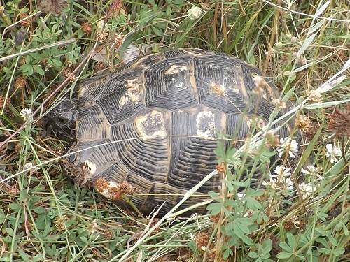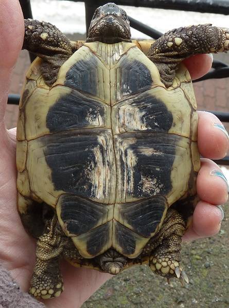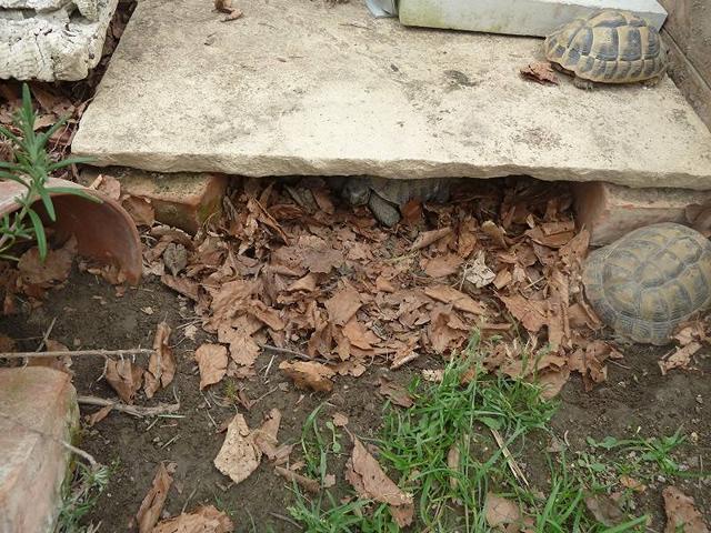 Testudo hermanni hermanni und Testudo marginata neigen jedoch dazu, sich an sonnigen Tagen kurz aufzuwärmen und anschließend wieder in ihren unterirdischen Verstecken zu verschwinden. Dies ist auch im natürlichen Lebensraum der Fall und kein Grund zur Besorgnis (2,9) Ein vorübergehend aktivierter Stoffwechsel verhindert die Konzentration von Giftstoffen im Organismus und kann das Risiko von Bakterienbedingten Problemen, die sich in einer Panzerröte oder Sepsis manifestieren, verringern. (2,6) Auch aus diesem Grund empfinde ich den Kühlschrank als suboptimal. Meine T.hermanni boettgeri bewegen sich während des Winters weniger, sind aber keineswegs starr. Im Frühjahr bin ich immer wieder erstaunt darüber, dass sich manche Exemplare mehrere Meter von ihrem ursprünglichen Überwinterungsort entfernt haben.