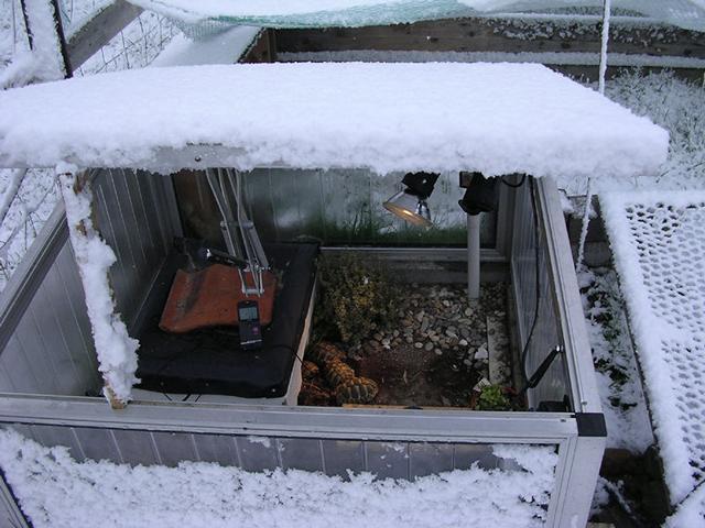Es wird auch berichtet, dass Schlüpflinge bei ungünstiger Witterung den kompletten Winter in der Eigrube verbringen und erst im folgenden Frühjahr ans Tageslicht kommen. (3) Dem natürlichen Vorbild entsprechend versuche ich, meine Schlüpflinge aus dem selben Jahr etwas länger wach zu halten als die älteren Tiere, indem ich ihnen im Oktober zusätzliche Wärme anbiete. Das Schlüpflingsgehege wird dabei nicht ins Haus geholt, sondern bleibt im Gewächshaus, da hier die Lichtausbeute größer ist und eine Nachtabsenkung besser zu bewerkstelligen ist.