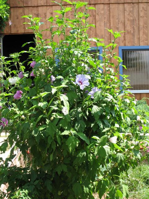 Der Hibiskus kann Wuchshöhen bis zu 4 m erreichen und ist deshalb nur für große Gehege geeignet. Der Strauch verträgt aber auch einen Rückschnitt im Frühjahr, wenn er zu groß geworden ist und zu viel Schatten wirft. Er ist in vielen Züchtungen mit Blütenfarben in weiß, rosa, lila und blau, mit gefüllten und ungefüllten Blüten erhältlich. In strengen Wintern kann der Hibiskus auch einmal zurückfrieren, treibt aber dann meist im Frühjahr von unten neu aus.