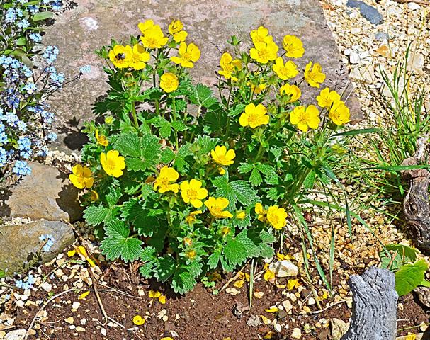 Großblütiges Fingerkraut, Erdbeerblättriges Fingerkraut Potentilla megalantha (syn. fragiformis): Im Gegensatz zu den Variationen, die von P. fruticosa abstammen, bildet das Erdbeerblättrige Fingerkraut niedrige, krautige Horste, die nicht verholzen, Wuchshöhe 10 – 20 cm. Es eignet sich somit hervorragend für Baby- und Jungtiergehege.