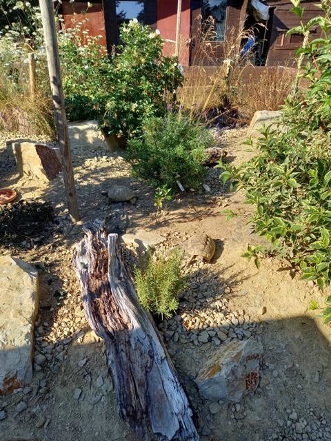 Nach drei Tagen hatten wir das Gröbste geschafft. Schwielige Hände und Rückenschmerzen ohne Ende waren nach dem Bau und dem betrachten des „neuen“ Geheges plötzlich gar nicht mehr soooo schlimm. Das Endergebnis sah schon sehr gut aus und die Frage war, wie es die Tiere annehmen. Aber die ersten Rundgänge zeigten, dass es die Schildkröten anscheinend nicht interessierte. Die Futterwiesen blieben ja so, sodass nicht alles neu für die Tiere war. Ziel war es, neben der natürlichen Gestaltung der Gehege, die Erhöhung der Bodentemperatur und Schaffung von sogenannten Wärmeinseln (Wegehaupt 2013). Messungen von mir im Monat Juli ergaben dann eine erhebliche Temperaturdifferenz. Die neu geschaffenen Gehegeabschnitte mit Kalkschotter waren um ca. 6 Grad wärmer als die Abschnitte in der Futterwiese mit Grasanteilen. Der Umbau bzw. die Optimierung somit voller Erfolg! Einen Artikel über meine Erfahrungen im „Schildkrötenhabitat auf Mallorca und die Umsetzung im eigenen Schildkrötengehege“ wurde in der „Schildkröten im Fokus, 03/20″ veröffentlicht.