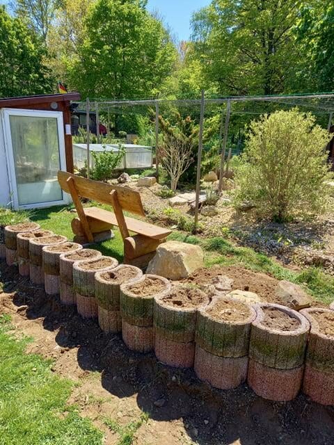Im Juni des letzten Jahres habe ich von unserem reichlich vorhandenen Garten 10 qm abzweigen dürfen und das Gehege der gemischten Gruppe erweitert. Neben einem weiteren Eiablageplatz (hier habe ich zwei übrig geblieben Wasserbausteine aus der Gehegeoptimierung aus dem Jahr 2019 verbaut), kann ich nun bequem auf einer Gartenbank mit passendem Schildkrötenmotiv unsere Panzerträger beobachten.