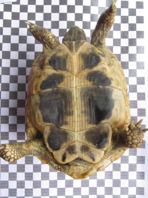 Für die Fotodokumentation müssen zwei Fotos gemacht werden. Je eines vom Rückenpanzer und vom Bauchpanzer. Als Hintergrund nehme ich ein Karopapier (Kantenlänge der Karos 1 cm). Man kann aber auch ein einfaches weißes Papier als Hintergrund nehmen und neben dem Tier ein Lineal als Größenvergleich legen. Natürlich sollte das Tier vorher gereinigt sein.