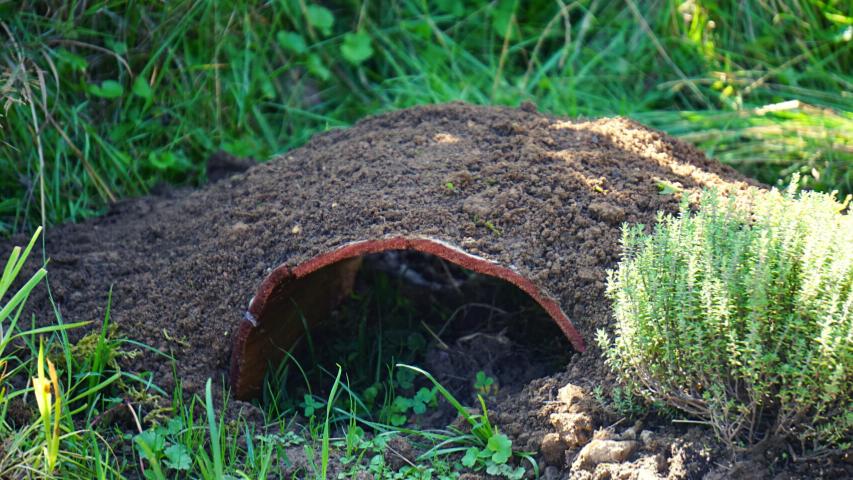 Als kleines Bonbon habe ich bei meinen täglichen Spaziergängen aus dem Wald ein gebogenes Baumrindenstück als Höhle verbaut. Hier habe ich noch übrig gebliebener Estrichbeton über die Rinde verteilt und Erde über den nassen Beton gestreut.