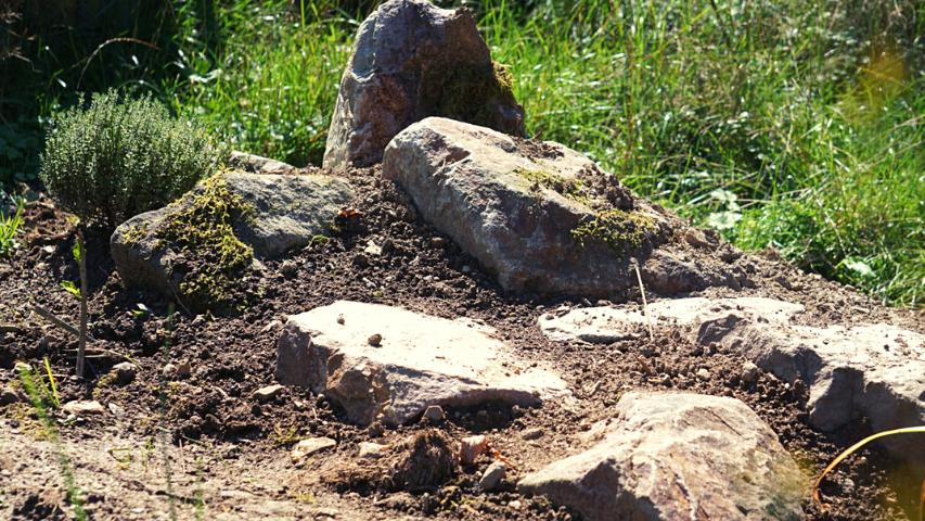 Für den Landteil der Gehegeerweiterung siedelte ich einen Lavendelstrauch vor dem Haus um. Zusätzlich wurden Salbei (Salva) und Eberraute (auch bekannt als Cola-Strauch (Artemisia abrotanum) beigepflanzt. Größere Steine/Findlinge im Gehege finde ich immer toll. Diese schön platziert und eingegraben sehen die Steine aus, als würden diese schon immer dort liegen. Bei unserer letzten größeren Gehegeumgestaltung mit Kalkschotter hatte ich auch verschiedene Wasserbausteine platziert. Diese werden von den Schildkröten gerne zur Thermoregulierung aufgesucht. Besonders im Frühjahr ist ein Großteil der Tiere dort anzutreffen und tanken Sonne und Wärme.