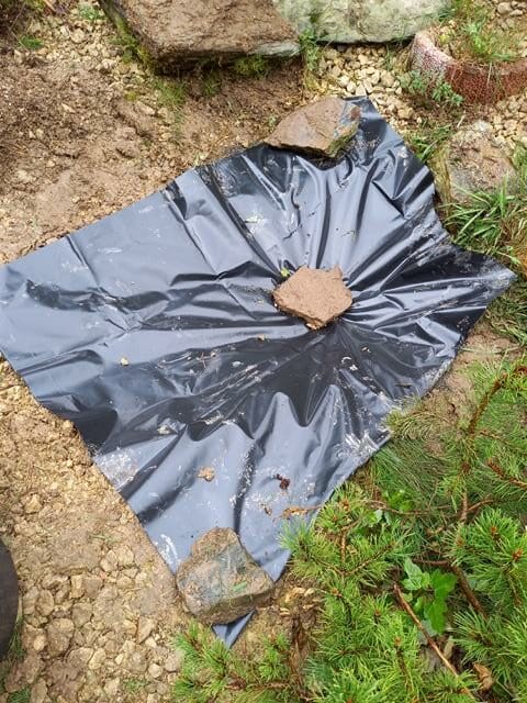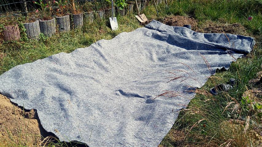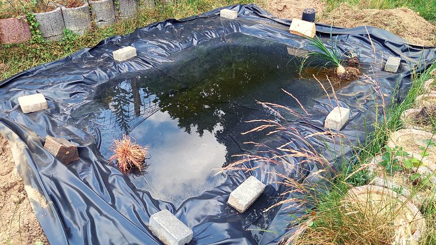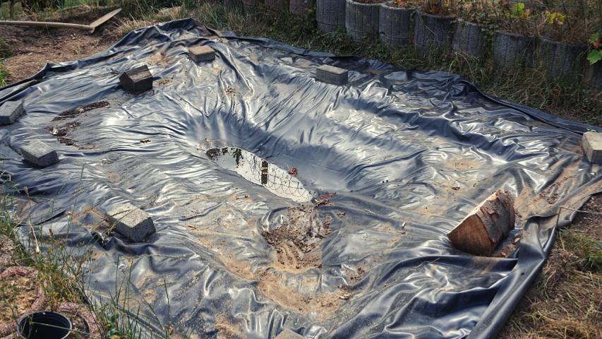 Nachdem ich mit dem Ausschachten so weit zufrieden war, ging es dann ans Modellieren der Wasserstelle. Ich habe mir dafür Teichfolie in der Größe 3×4 m/0.5 mm Dicke in schwarz* besorgt und als Schutz zwischen Boden und Teichfolie das passende Teichvlies*. Einmal ausgelegt ließ ich dann das Becken volllaufen, um zum einen zu kontrollieren, ob es keine undichte Stelle gibt zum anderen, ob die Ausmaßen bei vollem Wasserstand ausreichend sind bzw. wie ich es mir vorgestellt hatte. Passte alles!