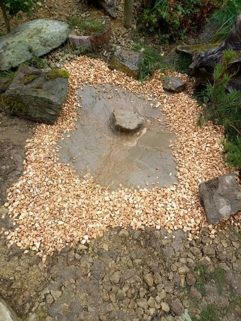 Wichtig beim Betonieren der Wasserstelle ist es, den Beton ziemlich feucht anzumischen und nach dem Aufbringen immer wieder zu wässern, damit der Betonestrich nicht zu schnell trocknet. Die Möglichkeit besteht dann, dass der Betonestrich zu porös wird und durch die starke Kapillarwirkung das Becken „leergesaugt“ wird. Beim Betonieren hatte ich Glück, denn obwohl es den ganzen Sommer über warm (zu weilen richtig heiß) und trocken war, begann es genau an dem Tag zu regnen, der dann auch noch einige Tage anhielt.